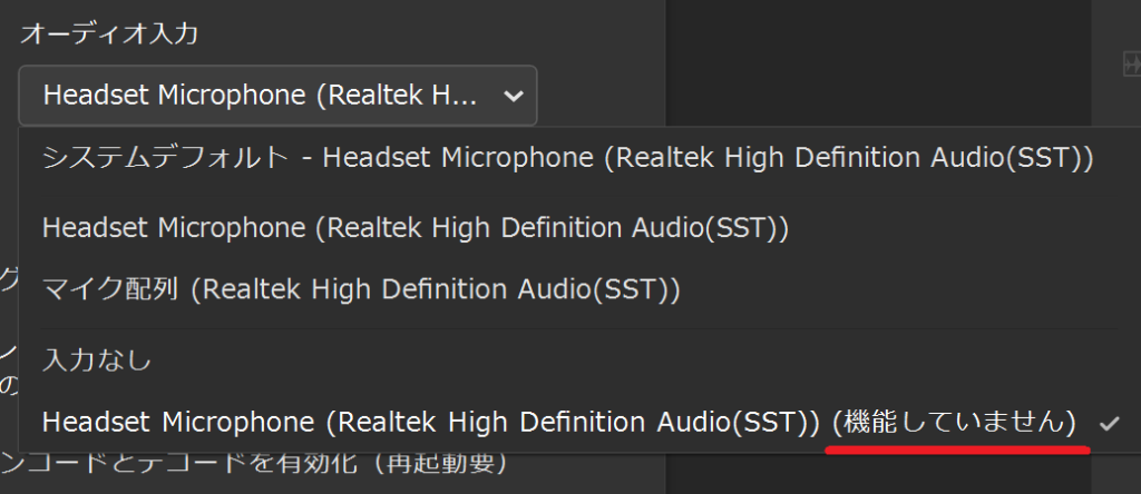 ちなみに、オーディオ出力だけでなく、入力も「機能していません」になっていました。